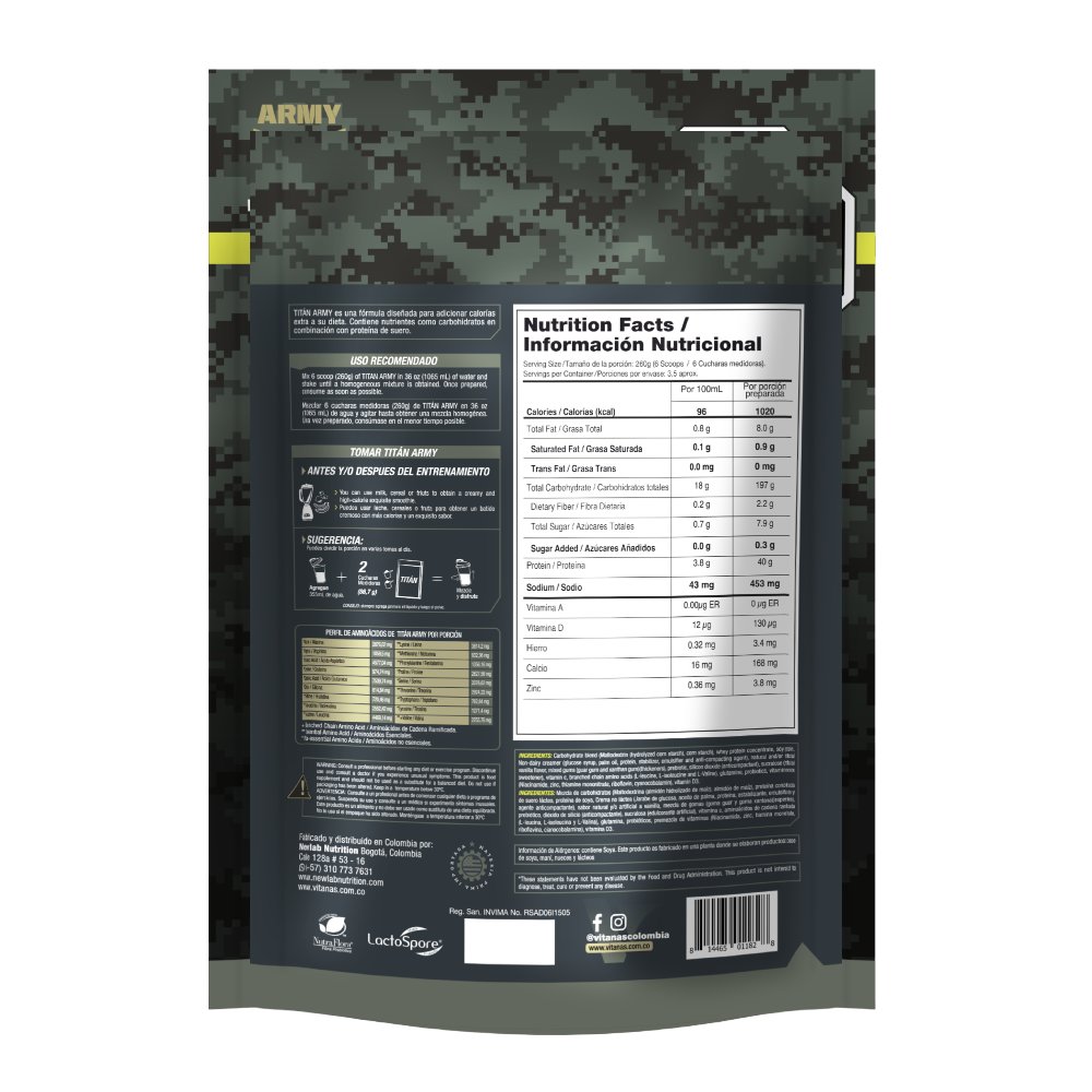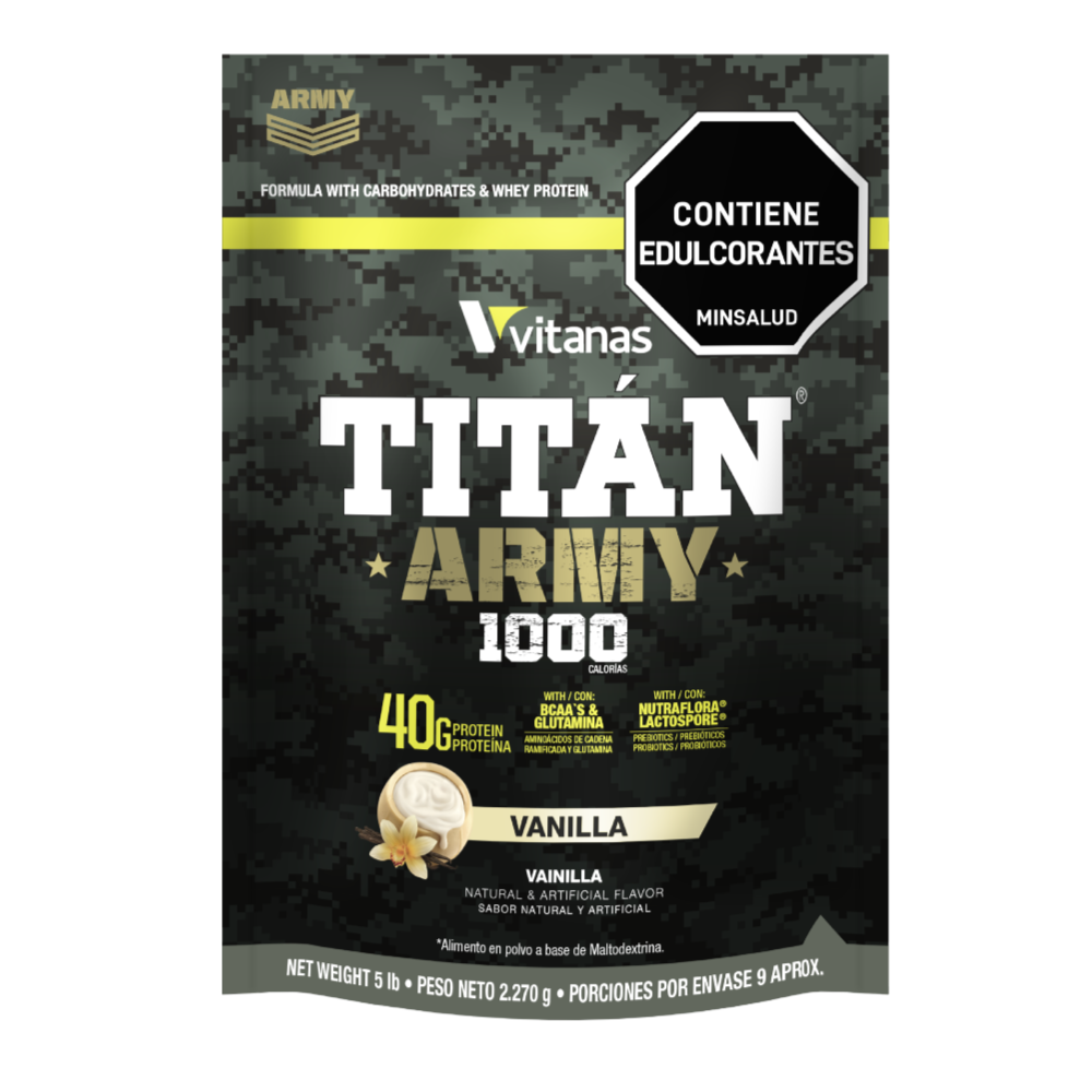 TITÁN ARMY, es una fórmula completa con proteína concentrada de suero lácteo, carbohidratos y una combinación de BCAAs, glutamina, probióticos y prebióticos. Enriquecida con Vitamina C, Vitamina D3 y una premezcla de vitaminas esenciales.