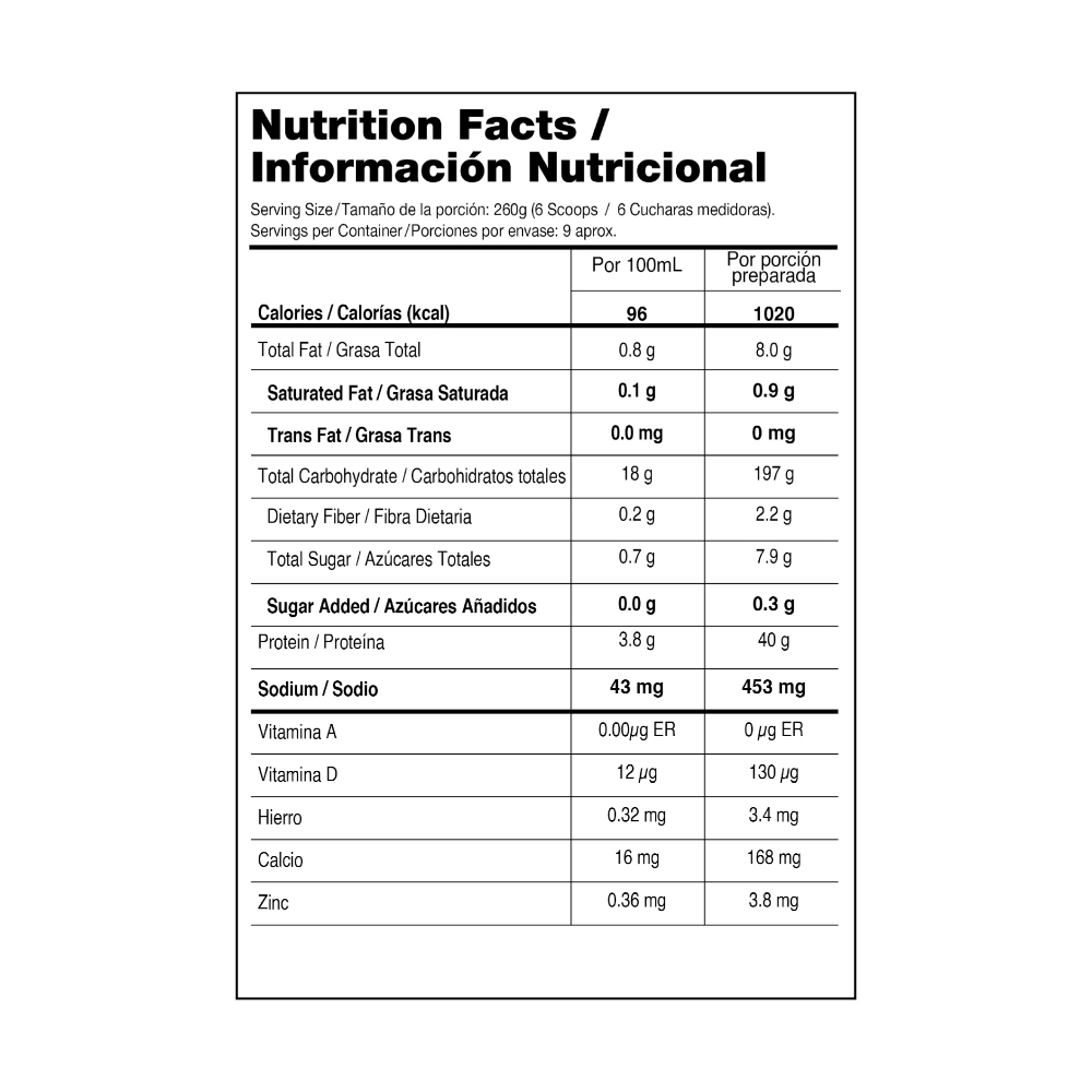 Ingredientes: Mezcla de carbohidratos (Maltodextrina (almidón hidrolizado de maiz), almidón de maiz), proteina concentrada de suero lácteo, proteína de soya, Crema no láctea (Jarabe de glucosa, aceite de palma, proteina, estabilizante, emulsificante y agente