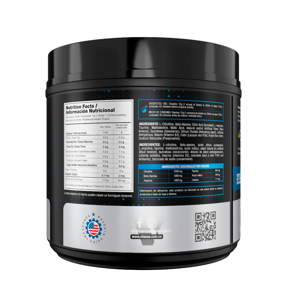 Modo de uso: Disolver 15g (1 scoop) de Dylator en 350 ml de agua, consumir 20 minutos antes de realizar actividad física.
