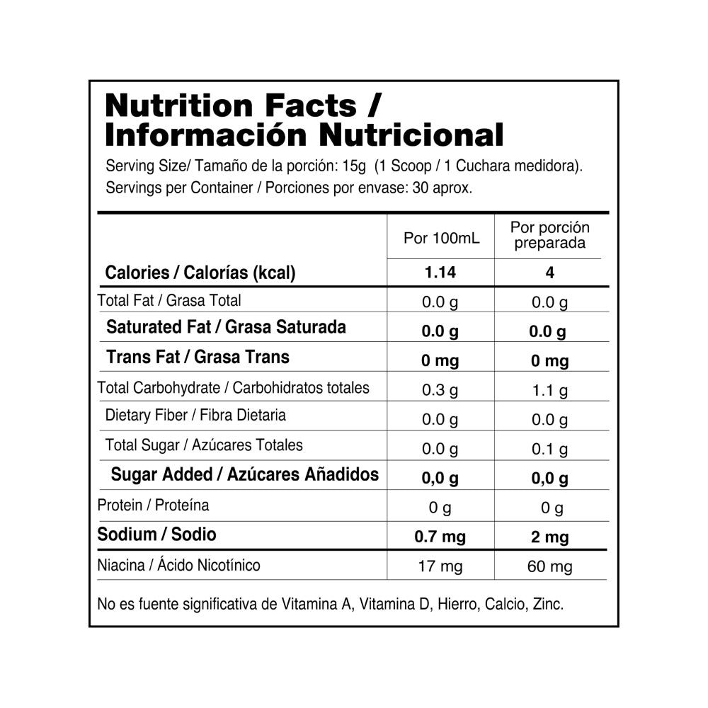 Ingredientes: L- Citrulina, Beta - Alanina, ácido citrico (acidulante), L- Arginina, taurina, maltodextrina, ácido malico, sabor natural y/o artificial, sucralosa (edulcorante), dioxido de silicio (antiglutinante), cafeína anhidra, niacina (vitamina B3), colorante (laca y color FD&C rojo nro. 40), benzoato de sodio (conservante).