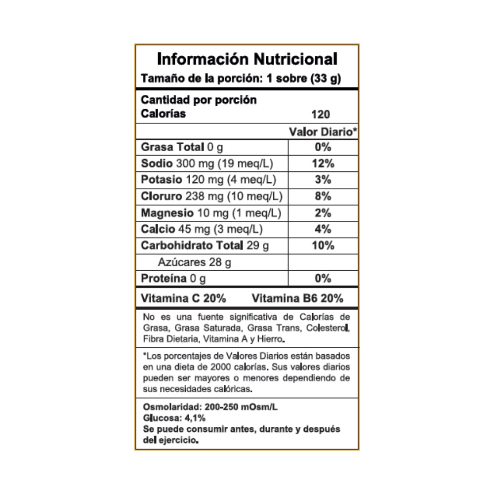 - Tipo de carbohidratos: dextrosa, fructosa, maltodextrina y sacarosa, todos de origen natural.