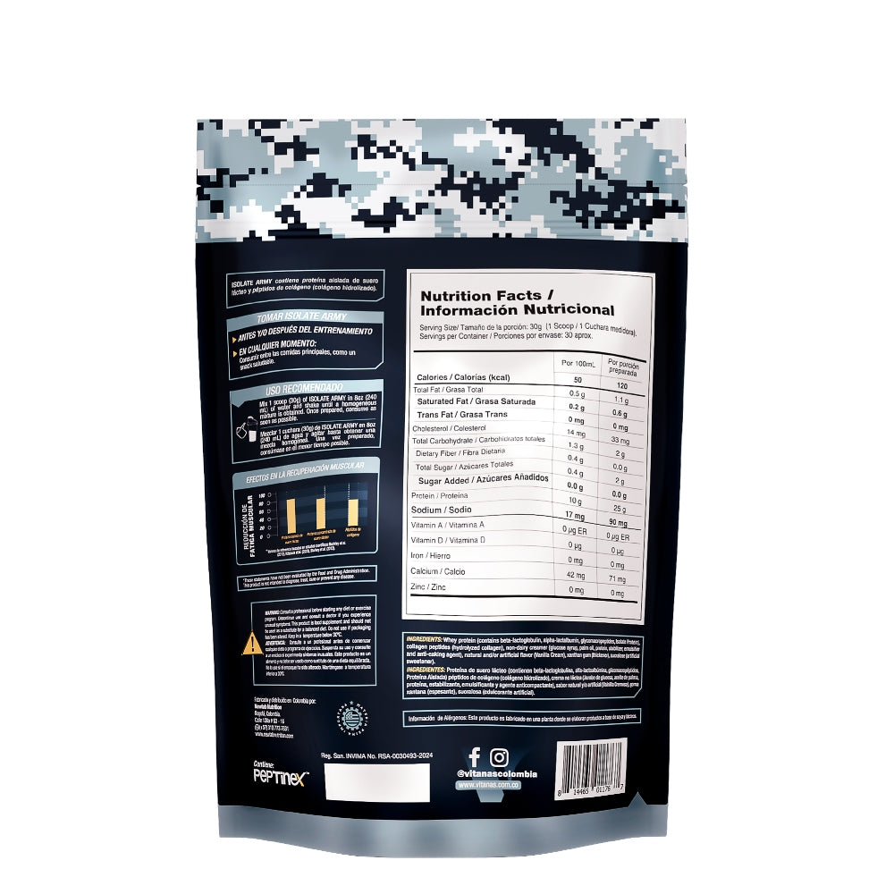 ISOLATE ARMY contiene proteína aislada de suero lácteo y péptidos de colágeno (colágeno hidrolizado).
